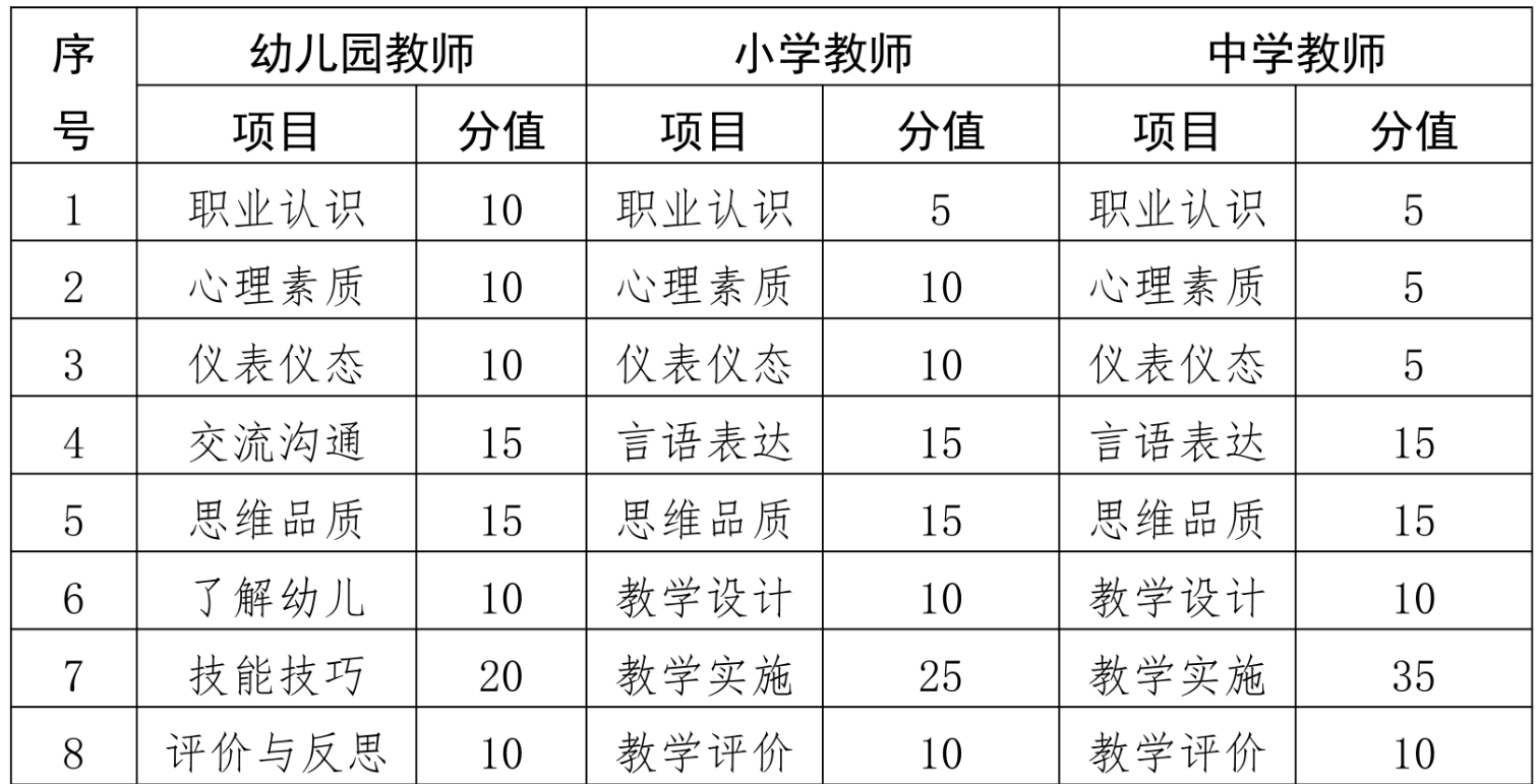 中小學(xué)教師資格考試(面試)滿分100分,各項目分值具體如下(中職教師面試分值同中學(xué)教師):