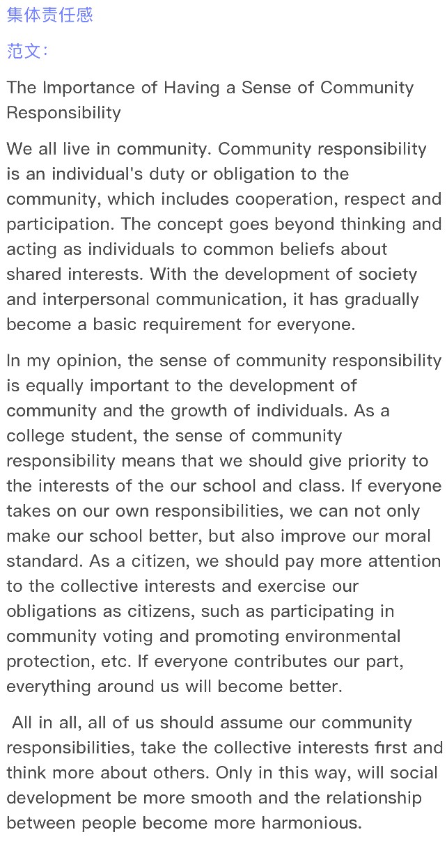 2019年12月英語六級(jí)考試已結(jié)束,四六級(jí)頻道在考后特別整理了2019年12月英語六級(jí)作文答案范文之集體責(zé)任感,僅供大家參考,祝大家順利通過六級(jí)考試!