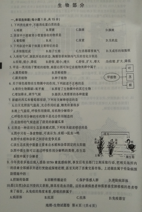 “人生處處是考場(chǎng),今日各為中考忙。斗智斗勇齊亮相,得失成敗走一場(chǎng)??紙?chǎng)瀟灑不虛枉,多年以后話滄桑!”2017年江西南昌中考生物科目考試已落下帷幕,中考頻道在考后第一時(shí)間提供2017年江西南昌中考生物試卷、南昌中考生物答案解析,供廣大考生參考估分。預(yù)祝各位考生取得優(yōu)異的成績(jī),順利考入理想的高中!稍后我們也將提供江西南昌中考成績(jī)查詢、中考分?jǐn)?shù)線,敬請(qǐng)關(guān)注!