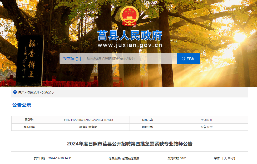 2024年度山東日照市莒縣公開招聘第四批急需緊缺專業(yè)教師公告已發(fā)布,報名時間:2025年1月5日-1月10日(上午8:30—12:00,下午14:00—17:30)?,F(xiàn)將招聘公告原文發(fā)布如下: