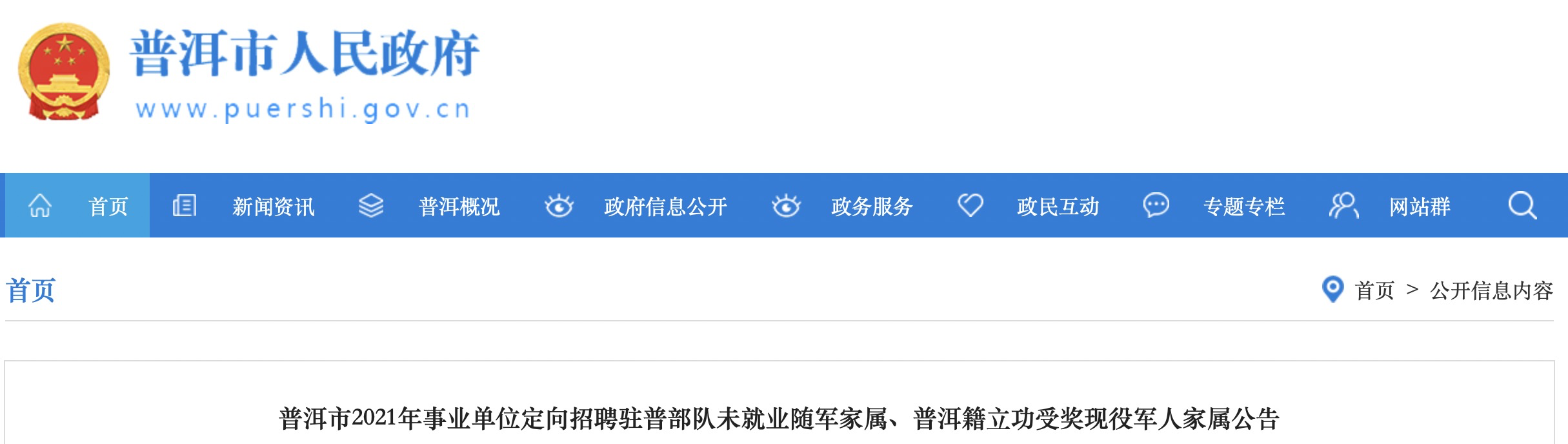 為切實做好軍人家屬就業(yè)工作,更好地服務(wù)部隊建設(shè),根據(jù)《云南省事業(yè)單位公開招聘工作人員辦法》和《普洱市人民政府普洱軍分區(qū)關(guān)于印發(fā)〈普洱市軍人隨軍家屬就業(yè)安置實施細(xì)則〉的通知》(普政發(fā)〔2020〕41號)等有關(guān)規(guī)定,現(xiàn)將普洱市2021年事業(yè)單位定向招聘駐普部隊未就業(yè)隨軍家屬、普洱籍立功受獎現(xiàn)役軍人家屬有關(guān)事項公告如下。