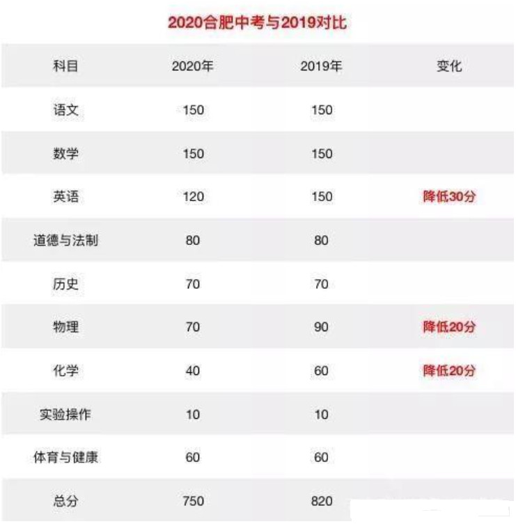 近日,安徽省教育相關(guān)部門發(fā)布通知,明確了2020年合肥市中考改革方案:英語降30分,物理降20分,化學(xué)降20分,2020年合肥市中考總分由原來的820分降為750分。