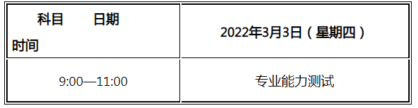 首輪全省統(tǒng)一專業(yè)能力測試時間為2022年3月3日,地點由各招生學校自主確定并通知參加本校專業(yè)能力測試的考生。具體測試時間與測試科目安排如下(北京時間):