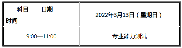 第二輪全省統(tǒng)一專業(yè)能力測試時間為2022年3月13日,地點由各招生學校自主確定并通知參加本校專業(yè)能力測試的考生。具體測試時間與測試科目安排如下(北京時間):