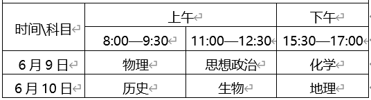 普通高中學(xué)業(yè)水平等級(jí)考試由山東省自主命題,考生從思想政治、歷史、地理、物理、化學(xué)、生物等6個(gè)科目中選報(bào)3科參加考試??荚嚂r(shí)間安排在6月9日-10日,每科考試時(shí)間為90分鐘。