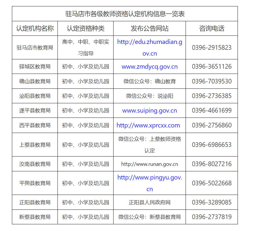 3.駐馬店市各級(jí)教師資格認(rèn)定機(jī)構(gòu)網(wǎng)站及聯(lián)系方式