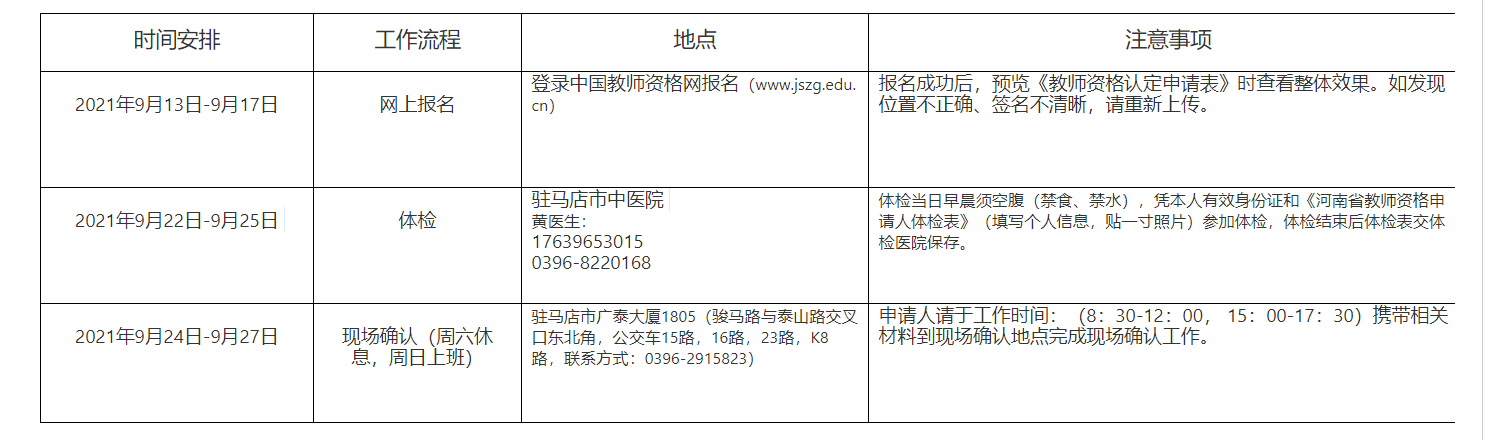 高級(jí)中學(xué)、中等職業(yè)學(xué)校、中等職業(yè)學(xué)校實(shí)習(xí)指導(dǎo)教師資格申請(qǐng)人現(xiàn)場(chǎng)確認(rèn)時(shí)間:2021年9月24日-9月27日(周六休息、周日上班)?,F(xiàn)場(chǎng)確認(rèn)地點(diǎn):駐馬店市廣泰大廈1805(駿馬路與泰山路交叉口東北角,公交車(chē)15路,16路,23路,K8路,工作時(shí)間:8:30-12:00,15:00-17:30聯(lián)系方式:0396-2915823)