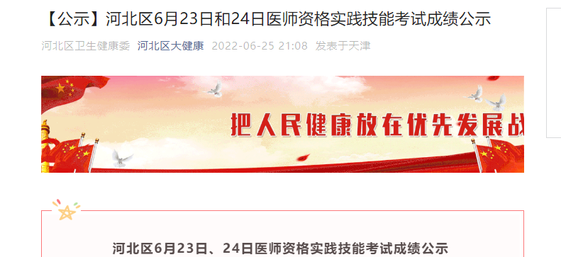 從河北區(qū)大健康公眾號(hào)獲悉,天津河北區(qū)2022年6月23日和24日醫(yī)師資格實(shí)踐技能考試成績(jī)已公布,請(qǐng)相關(guān)人員仔細(xì)閱讀,具體詳情如下: