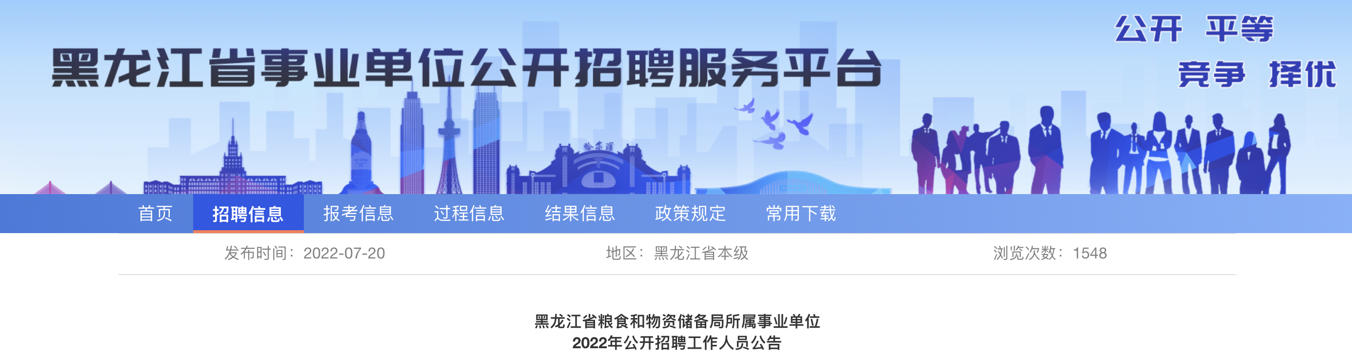 2022年黑龍江省糧食和物資儲備局所屬事業(yè)單位工作人員招聘公告【7人】已發(fā)布,網(wǎng)絡(luò)報(bào)名時(shí)間為:2022年7月28日9時(shí)至8月3日17時(shí),現(xiàn)將招聘公告原文發(fā)布如下: