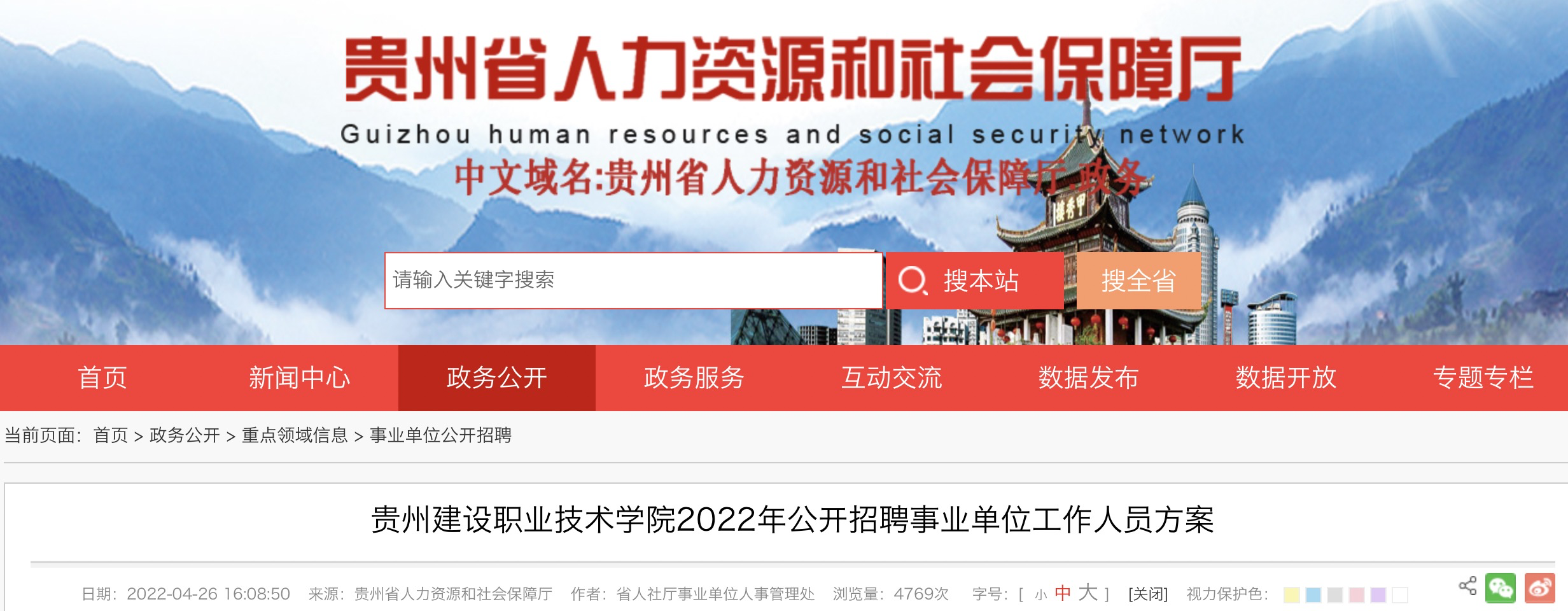 在貴州人力資源社會保障網(wǎng)(http://rst.guizhou.gov.cn)、貴州建設(shè)職業(yè)技術(shù)學院(http://www.gzjszy.cn/)發(fā)布公開招聘公告。公告時間從 2022年4月26日到2022年5月8日。