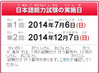 日本語能力測(cè)試將每年舉辦兩次,分別于7月和12月的第一個(gè)星期日實(shí)施。由日本得知2014年日本語能力測(cè)試(JLPT)考試時(shí)間為:2014年7月6日;2014年12月7日。