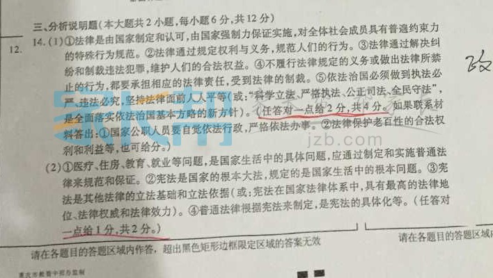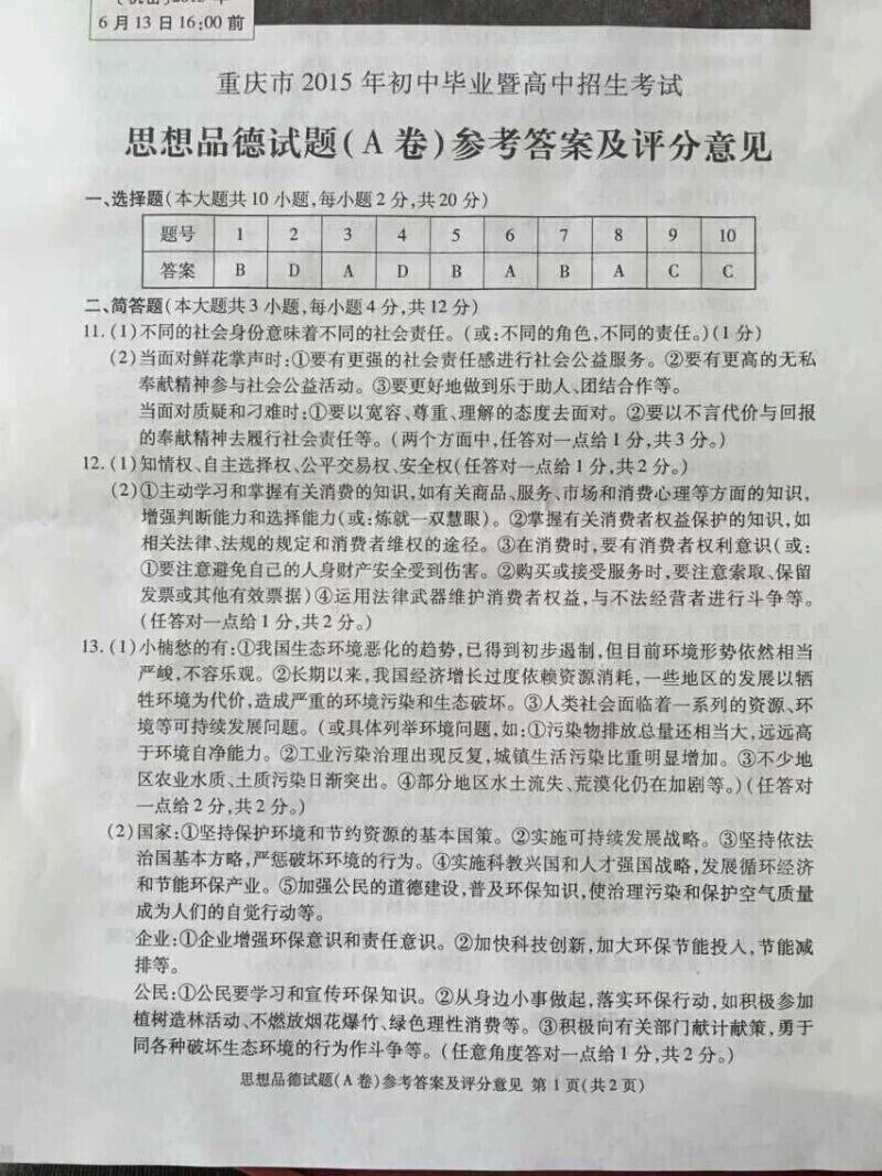 2015年重慶沙坪壩中考政治答案A卷(已公布)