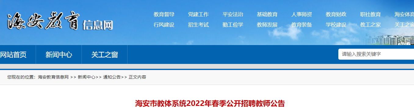 2022春季江蘇南通海安市教體系統(tǒng)公開招聘教師146人,報名時間:2022年2月16日09:00~2月18日17:00。現(xiàn)將招聘公告原文發(fā)布如下: