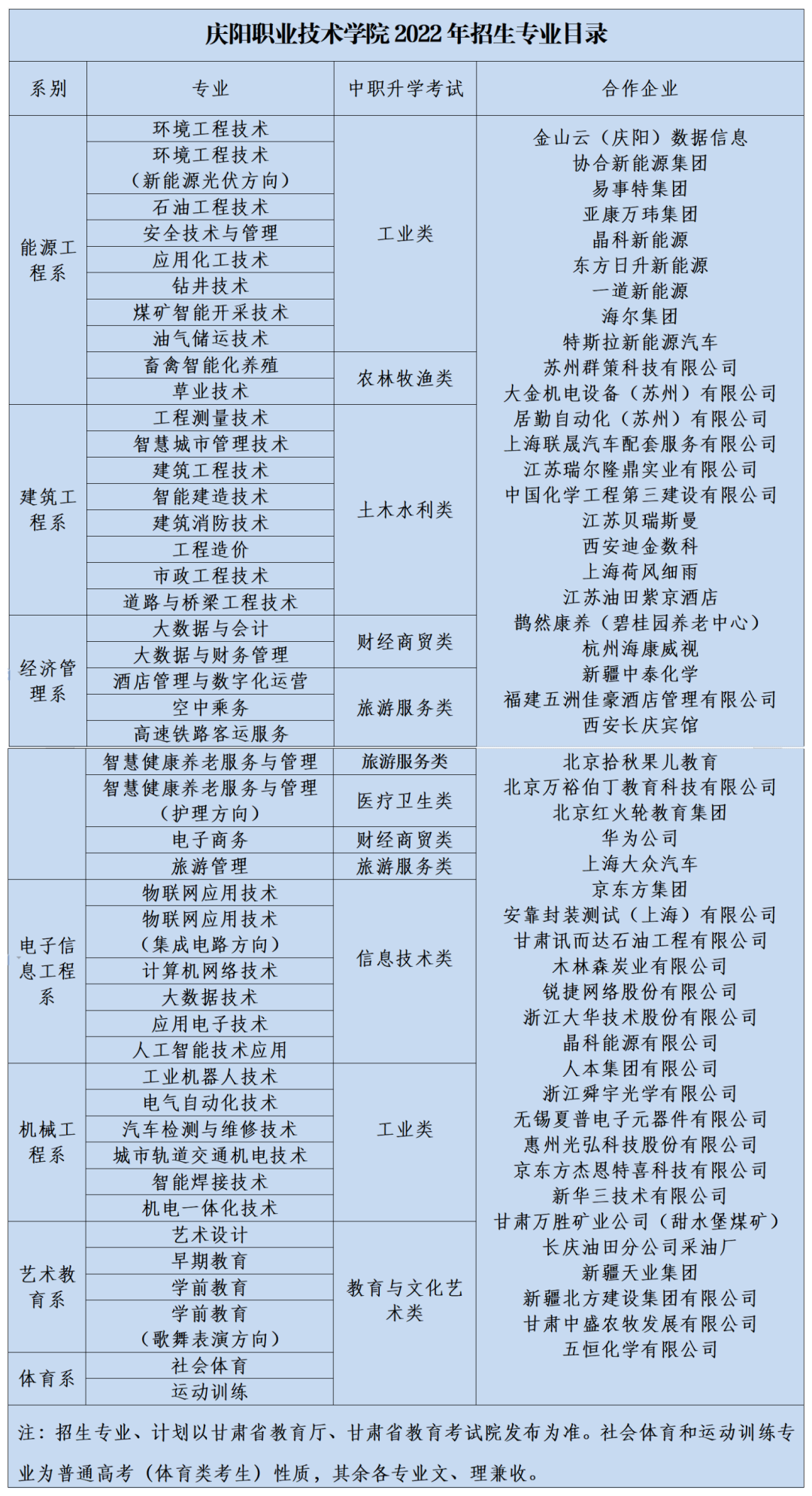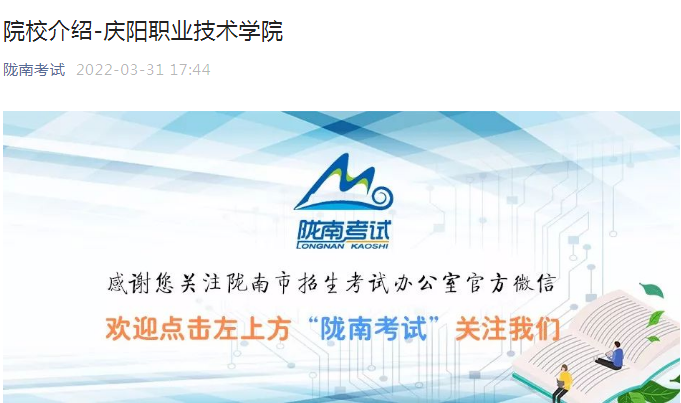 從隴南考試了解到,甘肅慶陽(yáng)職業(yè)技術(shù)學(xué)院2022年招生簡(jiǎn)章已發(fā)布,詳細(xì)內(nèi)容如下: