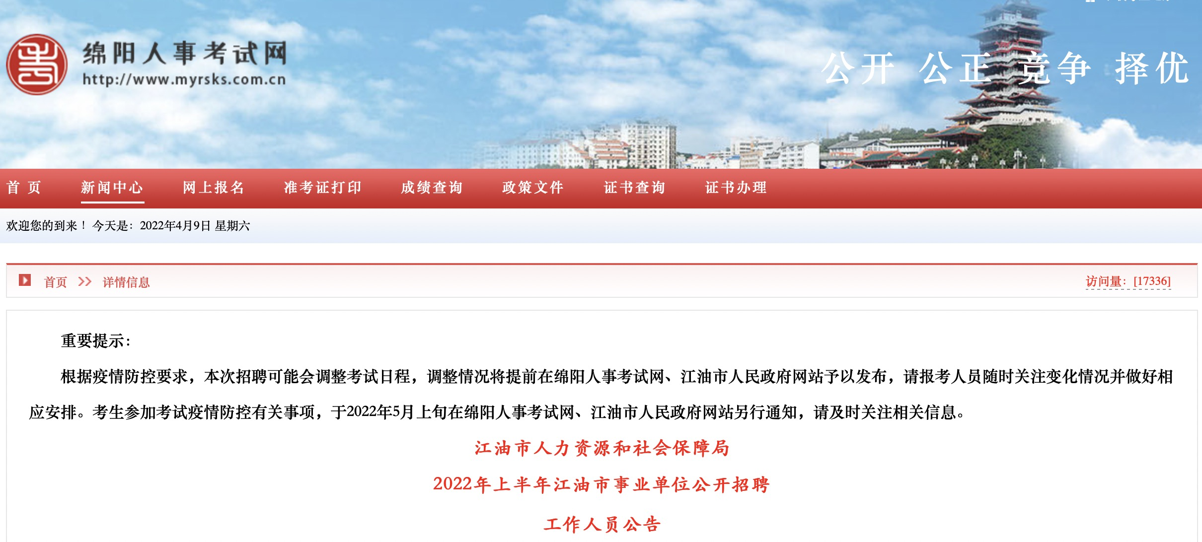 2022年四川綿陽(yáng)江油市事業(yè)單位事業(yè)編制工作人員招聘公告【216人】已發(fā)布,網(wǎng)絡(luò)報(bào)名時(shí)間為:2022年4月20日至2022年4月26日上午12:00,現(xiàn)將招聘公告原文發(fā)布如下: