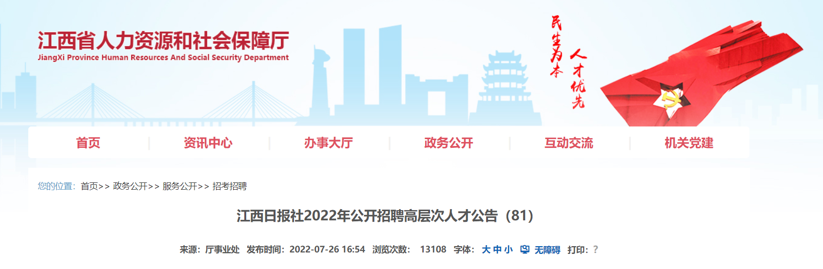 2022江西省日報社招聘高層次人才公告(81)已發(fā)布。報名時間:從即日起至2022年8月4日。現將招聘公告原文發(fā)布如下: