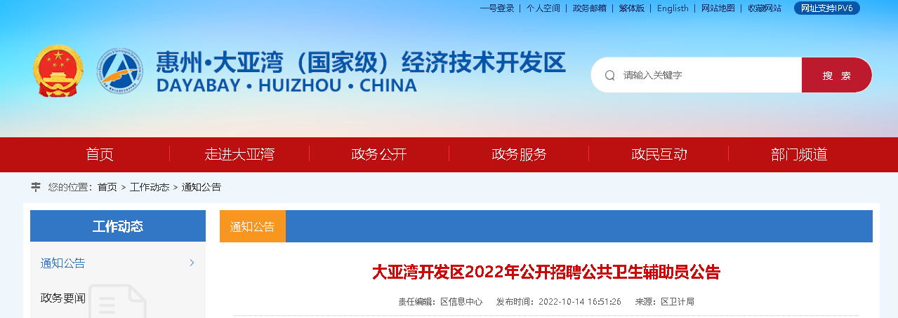 2022廣東惠州市大亞灣開發(fā)區(qū)招聘公共衛(wèi)生輔助員20人,報名時間:2022年10月28日8時至10月31日18時,現(xiàn)將招聘公告原文發(fā)布如下: