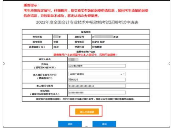 考生點擊“我已知悉”后,系統(tǒng)進入退費申請表填寫頁面,考生輸入正確的開戶地、開戶行、銀行卡賬號、手機號碼等退費信息后,點擊“確認申請退費”按鈕,如下圖所示: