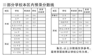 部分高中劃定區(qū)內(nèi)預(yù)錄線根據(jù)北京市教育考試院安排,今天市中招辦將完成統(tǒng)招初錄。昨天(23日,下同),記者從部分區(qū)縣了解到,部分示范高中劃定了本區(qū)內(nèi)的預(yù)錄分?jǐn)?shù)線。