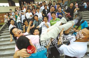 同學(xué)們將班主任老師陳厚波舉起歡呼,共同慶祝高考結(jié)束