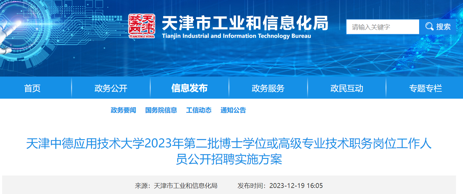 公開招聘方案于2023年12月19日在天津市工業(yè)和信息化局網(wǎng)站通知公告專欄(https://gyxxh.tj.gov.cn/ZWXX5652/TZGG644/2023n/)、天津中德應(yīng)用技術(shù)大學(xué)網(wǎng)站招聘公告專欄(http://www.tsguas.edu.cn/rczp/zpgg.htm)發(fā)布。