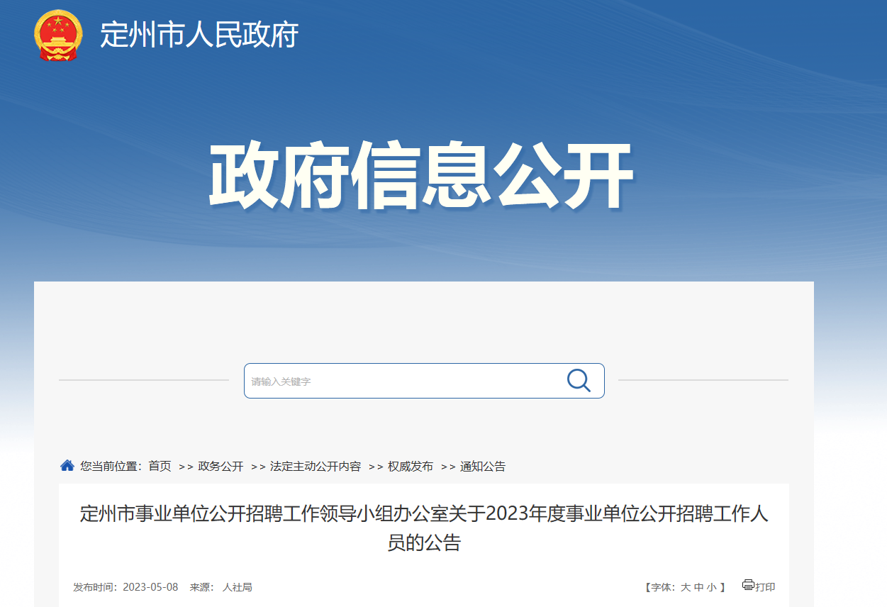 本次招聘發(fā)布公告時(shí)間擬定于2023年5月8日,在定州市人民政府網(wǎng)(www.dzs.gov.cn)定州市人事考試網(wǎng)(http://221.192.200.180:8088)發(fā)布。