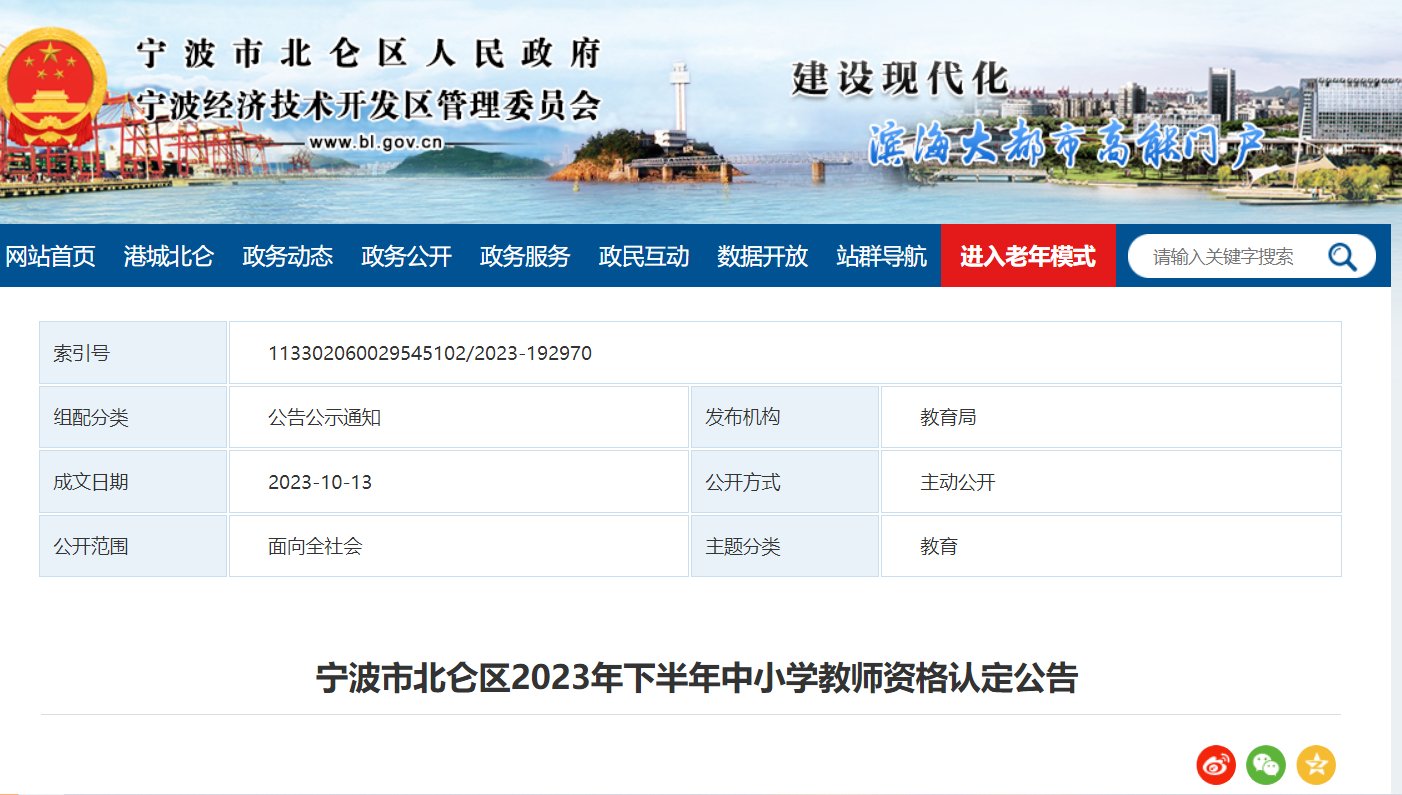 從寧波市北侖區(qū)人民政府網(wǎng)獲悉,2023下半年浙江寧波市北侖區(qū)中小學(xué)教師資格認(rèn)定公告已公布,確認(rèn)時間為10月26日至27日,具體詳情如下: