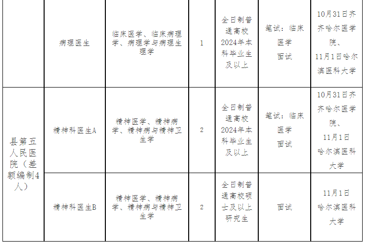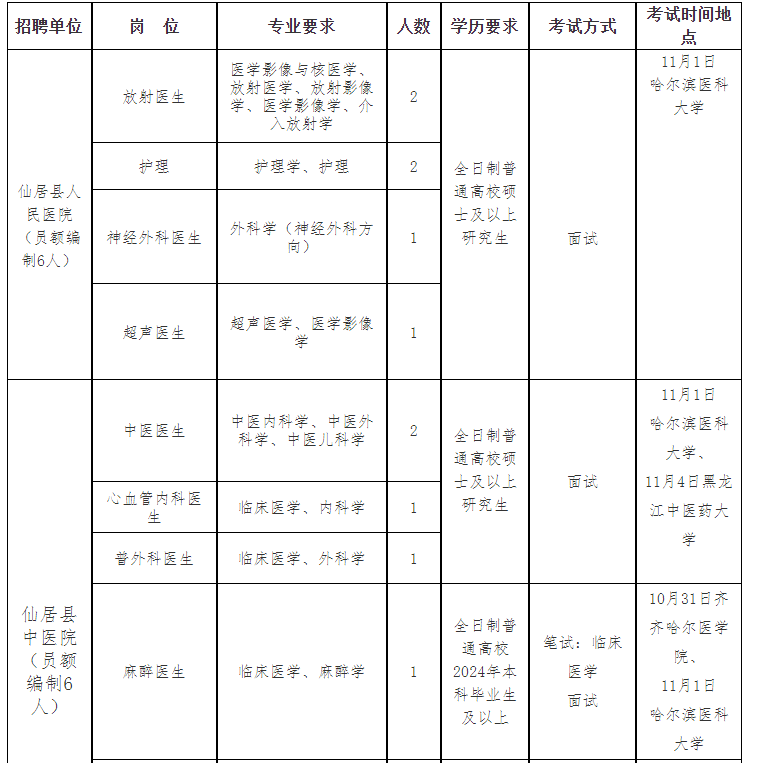 為滿足我縣衛(wèi)健系統(tǒng)對(duì)優(yōu)秀專業(yè)人才的需求,經(jīng)相關(guān)部門同意,仙居縣衛(wèi)生健康局下屬醫(yī)療衛(wèi)生單位于2023年10月31日-11月4日在齊齊哈爾醫(yī)學(xué)院、哈爾濱醫(yī)科大學(xué)、黑龍江中醫(yī)藥大學(xué)召開招聘會(huì),擬招聘醫(yī)學(xué)類全日制普通高校碩士研究生、全日制普通高校2024年本科畢業(yè)生共計(jì)16名,具體招聘事項(xiàng)公告如下: