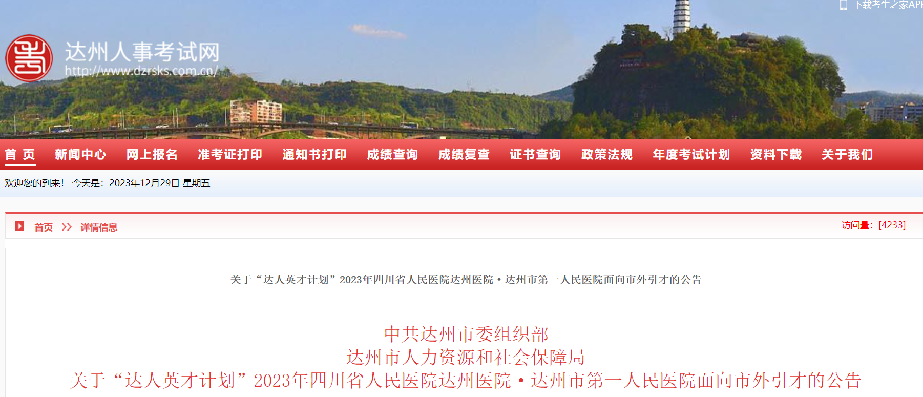 2023年四川省人民醫(yī)院達(dá)州醫(yī)院·達(dá)州市第一人民醫(yī)院面向市外引才公告已發(fā)布,報(bào)名時(shí)間:2023年12月27日9:00—2024年1月10日17:00?,F(xiàn)將招聘公告原文發(fā)布如下: