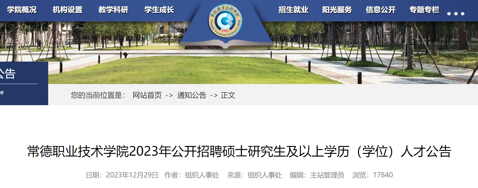 2023年湖南常德職業(yè)技術(shù)學(xué)院公開(kāi)招聘碩士研究生及以上學(xué)歷(學(xué)位)人才公告已發(fā)布,網(wǎng)上報(bào)名時(shí)間:2024年1月9日9:00至1月11日16:00?,F(xiàn)將招聘公告原文發(fā)布如下: