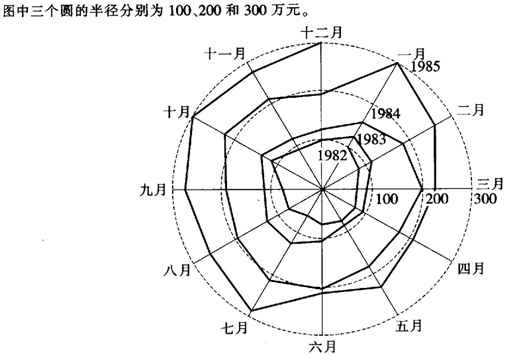 1982~1985年某商場(chǎng)月銷售額螺旋線示意圖(單位:萬(wàn)元)