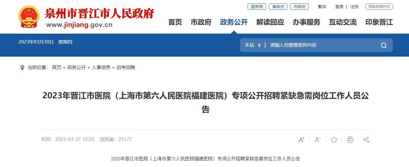 2023福建泉州晉江市醫(yī)院(上海市第六人民醫(yī)院福建醫(yī)院)專項公開招聘緊缺急需崗位58人,報名時間:2023年3月27日—2023年4月5日17:30。現(xiàn)將招聘公告原文發(fā)布如下: