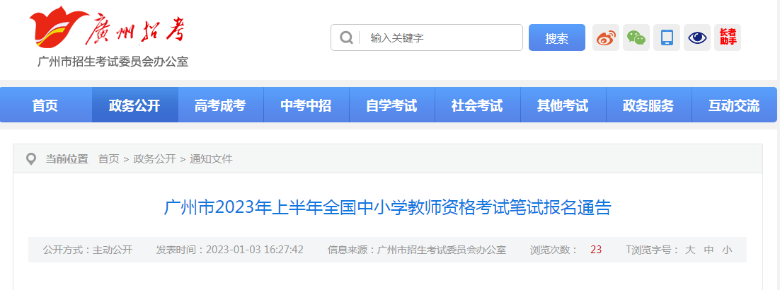 從廣州市招生考試委員會(huì)辦公室獲悉,2023上半年廣東廣州中小學(xué)教師資格考試筆試報(bào)名通告已公布,1月13日起報(bào)名,具體詳情如下: