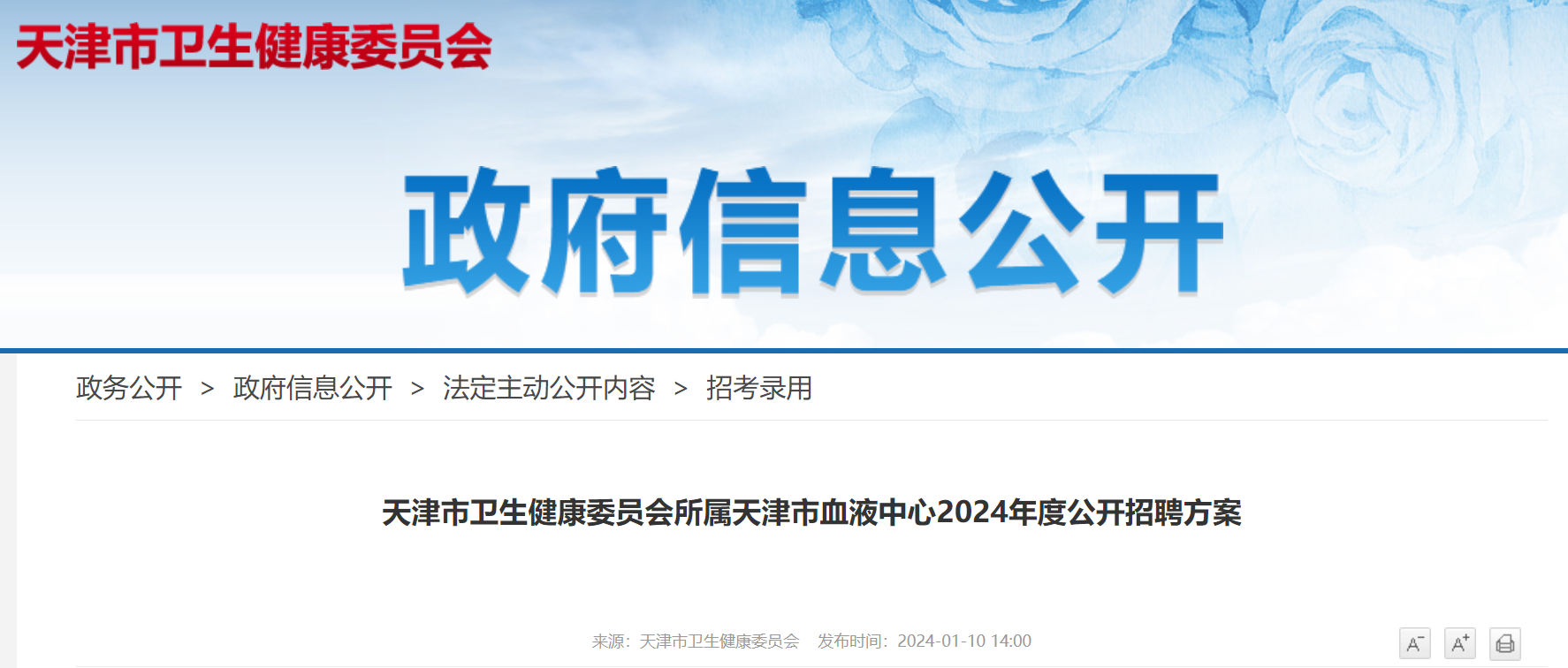 2024年1月10日,我單位公開招聘方案在天津市衛(wèi)生健康委員會網(wǎng)站(wsjk.tj.gov.cn)、天津衛(wèi)生人才網(wǎng)(www.tjwsrc.com)及我單位網(wǎng)站(www.tjbc.org.cn)發(fā)布。