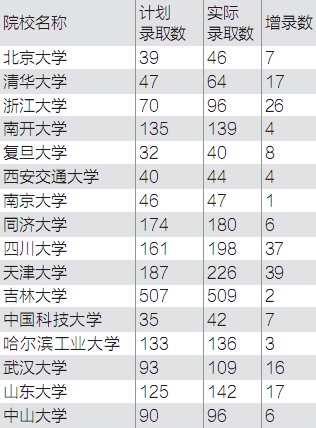 增加招生名額的還有北大和清華大學(xué),北大原計(jì)劃招收39人,結(jié)果招收了46人,增加7人。清華大學(xué)原計(jì)劃招收47人,結(jié)果招收了64人,增加了17人。