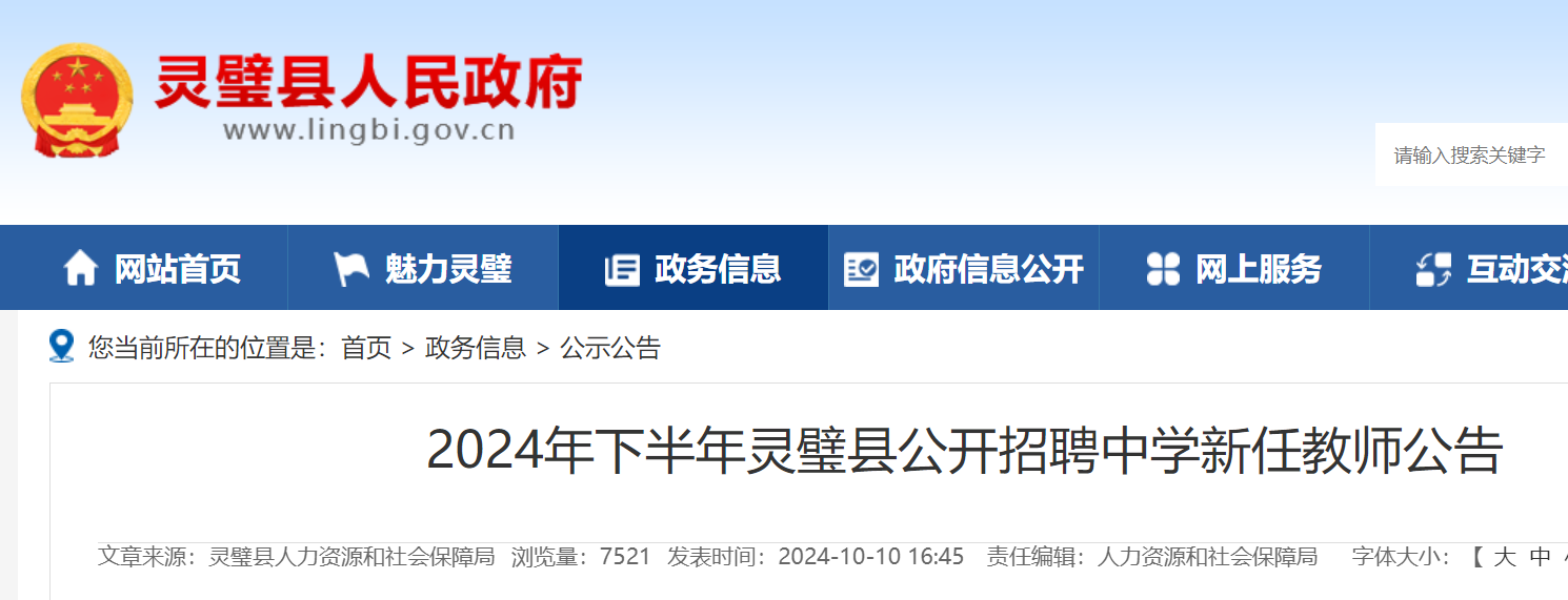 2024年下半年安徽宿州靈璧縣公開招聘中學(xué)新任教師公告已發(fā)布,報名時間:2024年10月20日9:00至10月24日17:00,逾期不再補報。現(xiàn)將招聘公告原文發(fā)布如下: