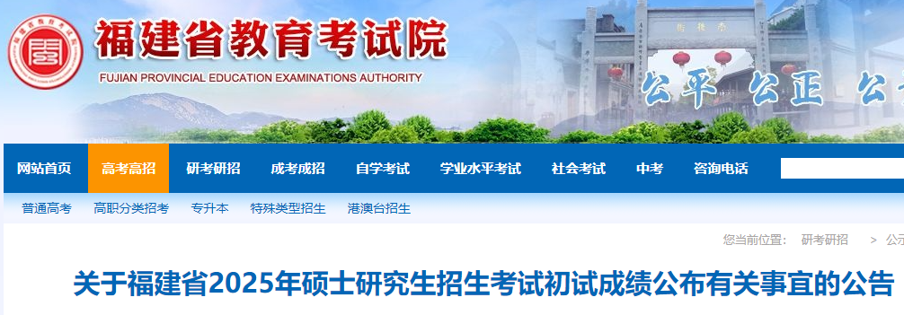根據(jù)教育部規(guī)定,福建省2025年碩士研究生招生考試初試成績(jī)將于2月24日下午15:00,由我省各碩士研究生招生單位向考生公布,具體事宜公告如下: