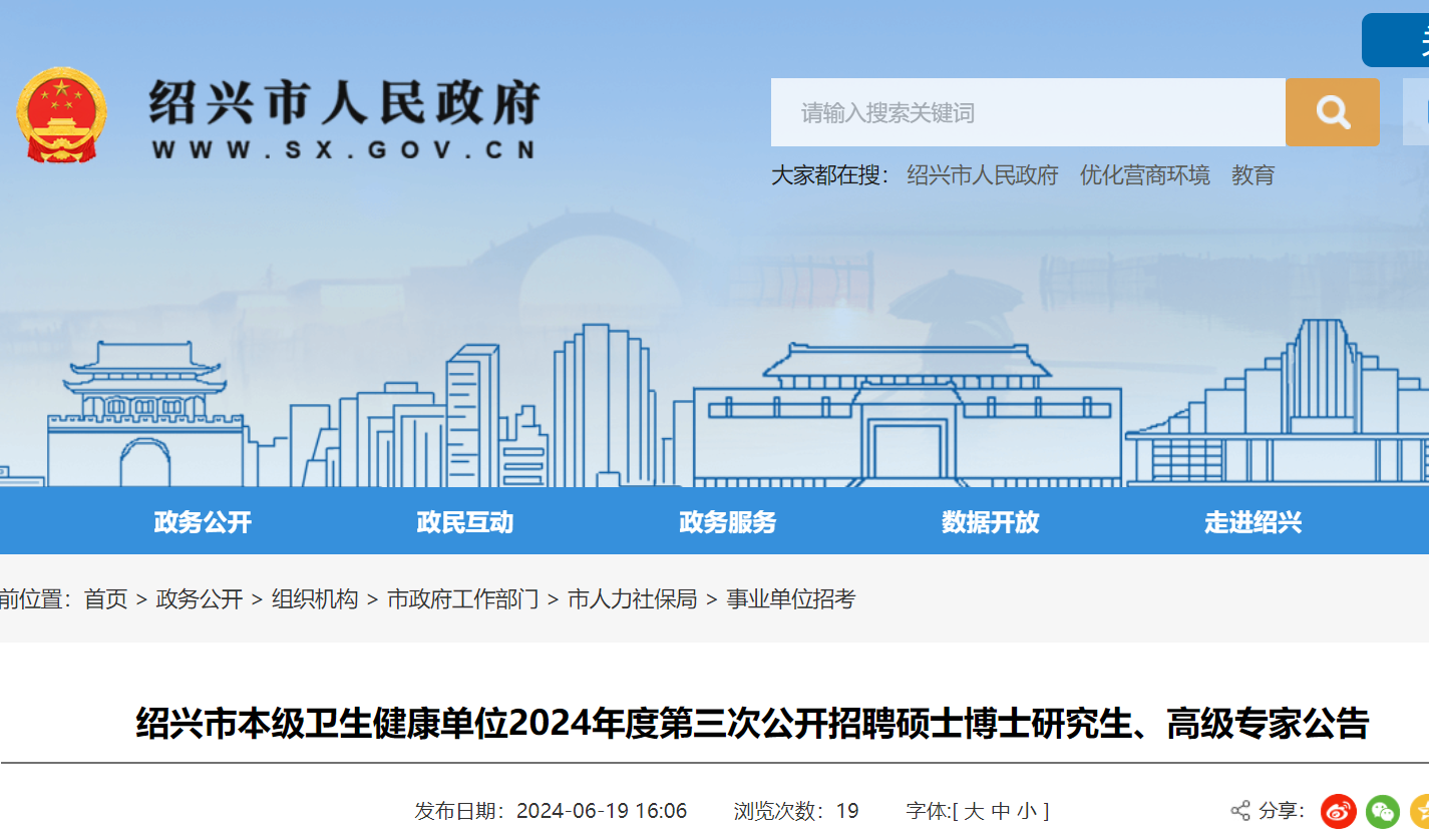 2024年度浙江紹興市本級(jí)衛(wèi)生健康單位第三次公開招聘碩士博士研究生、高級(jí)專家公告已發(fā)布,報(bào)名時(shí)間從6月20日開始至6月28日截止?,F(xiàn)將招聘公告原文發(fā)布如下:
