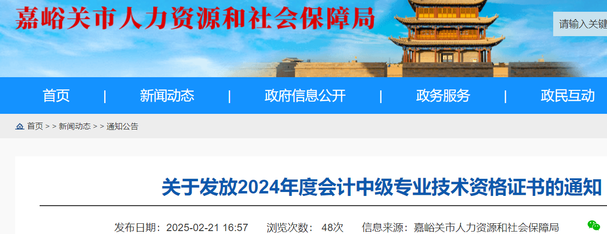 小編根據(jù)嘉峪關(guān)市人力資源和社會(huì)保障局發(fā)布“關(guān)于發(fā)放2024年度會(huì)計(jì)中級(jí)專業(yè)技術(shù)資格證書的通知”得知,甘肅嘉峪關(guān)2024年中級(jí)會(huì)計(jì)證書領(lǐng)取時(shí)間為2025年2月21日起。