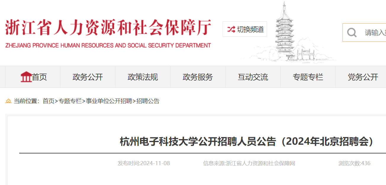 根據(jù)《浙江省事業(yè)單位公開招聘人員暫行辦法》規(guī)定及有關(guān)文件精神,結(jié)合在北京舉辦的2024年浙江省高層次人才洽談會工作部署,杭州電子科技大學決定在北京高層次人才洽談會現(xiàn)場公開招聘工作人員?,F(xiàn)將有關(guān)事項公告如下: