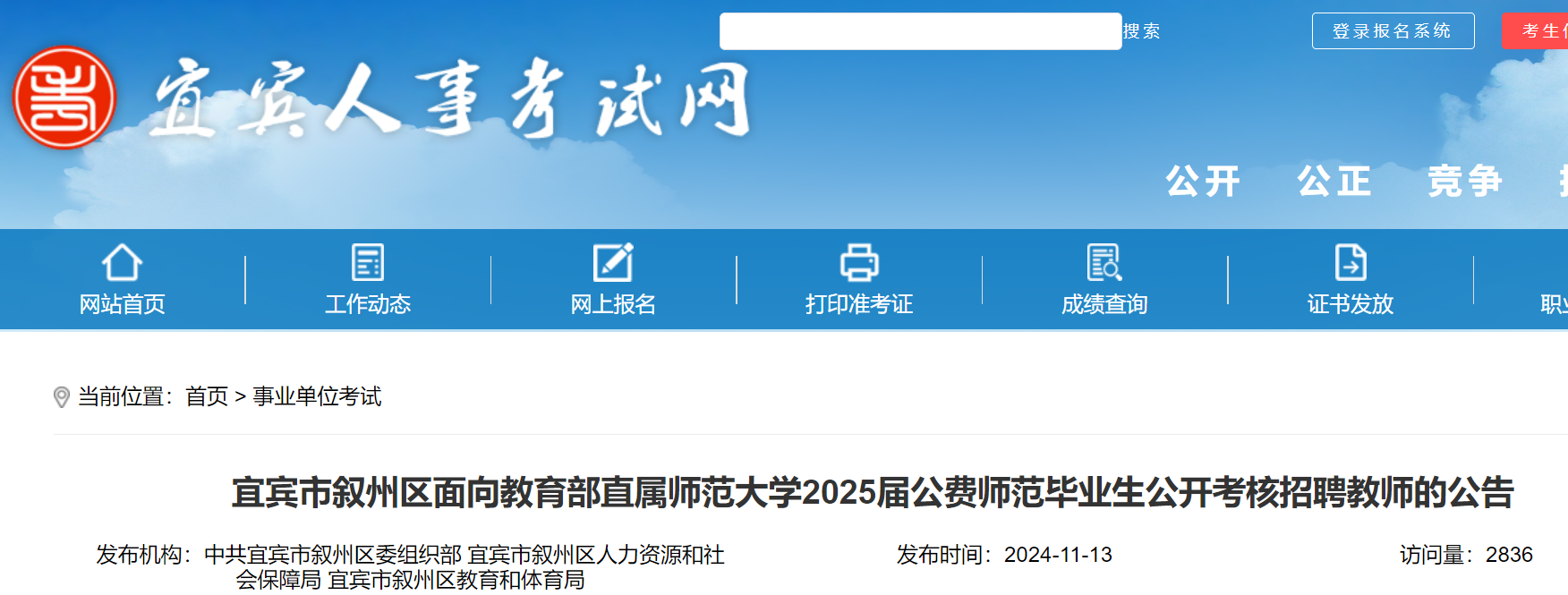 根據(jù)國家、省、市有關(guān)事業(yè)單位公開招聘工作人員規(guī)定和《教育部直屬師范大學(xué)師范生公費教育實施辦法》的相關(guān)要求,宜賓市敘州區(qū)面向教育部直屬師范大學(xué)2025屆公費師范畢業(yè)生(以下簡稱部屬公費師范畢業(yè)生)公開考核招聘教師工作,通過雙向選擇,按照公開、平等、競爭、擇優(yōu)的原則進行專項招聘,現(xiàn)將有關(guān)事項公告如下。