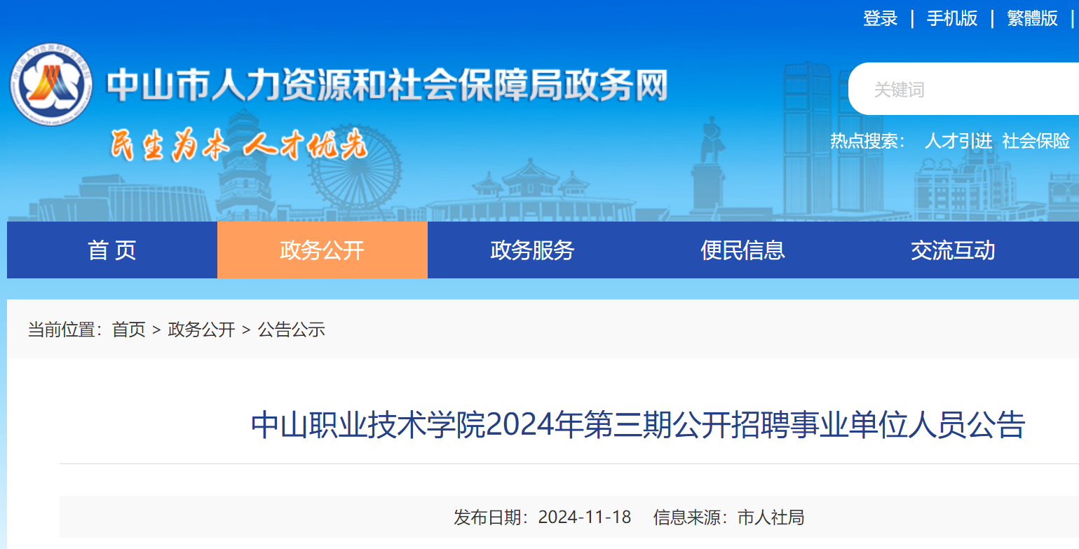 中山職業(yè)技術(shù)學院是全日制普通高等學校。因工作需要,決定面向社會公開招聘事業(yè)單位人員。為確保此次招聘工作順利進行,根據(jù)《廣東省事業(yè)單位公開招聘人員辦法》(廣東省人民政府令第301號)及有關(guān)文件規(guī)定,現(xiàn)將有關(guān)事項公告如下: