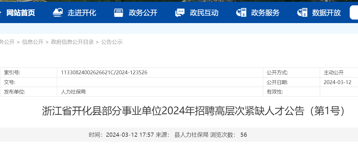 小編根據(jù)開(kāi)化縣人力資源和社會(huì)保障局發(fā)布”浙江省開(kāi)化縣部分事業(yè)單位2024年招聘高層次緊缺人才公告(第1號(hào))“得知,2024年浙江衢州市開(kāi)化縣部分事業(yè)單位招聘高層次緊缺人才3名。