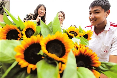 向日葵送考生綠波仙子、醉云長(zhǎng)、三陽(yáng)開(kāi)泰……昨天,市農(nóng)業(yè)技術(shù)推廣站將500枝彩色向日葵免費(fèi)贈(zèng)送給高考的學(xué)子。據(jù)悉,本市從國(guó)外引進(jìn)了40余個(gè)彩色向日葵品種,經(jīng)過(guò)試驗(yàn)取得成功。向日葵最為獨(dú)特的是所有品種均沒(méi)有花粉,適宜所有人群。據(jù)了解,此次免費(fèi)贈(zèng)送的向日葵是綠波仙子、醉云長(zhǎng)、三陽(yáng)開(kāi)泰、金色08等四個(gè)品種,花期在10天左右。