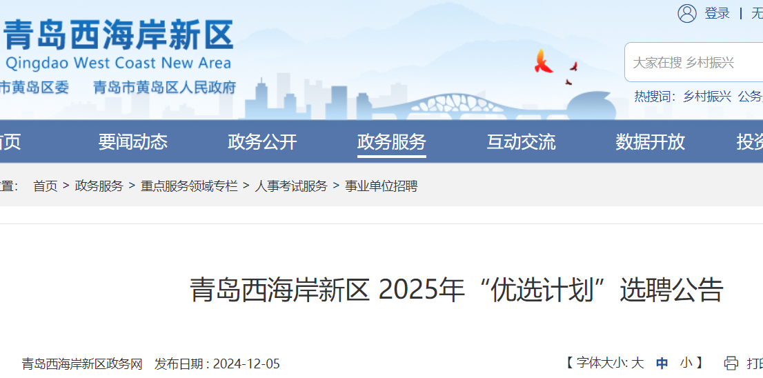 小編根據(jù)青島西海岸新區(qū)工委、管委 主辦發(fā)布“青島西海岸新區(qū) 2025年“優(yōu)選計(jì)劃”選聘公告”得知,2024年12月山東青島西海岸新區(qū)招聘70名,報(bào)名時(shí)間為12月9日-12月13日。