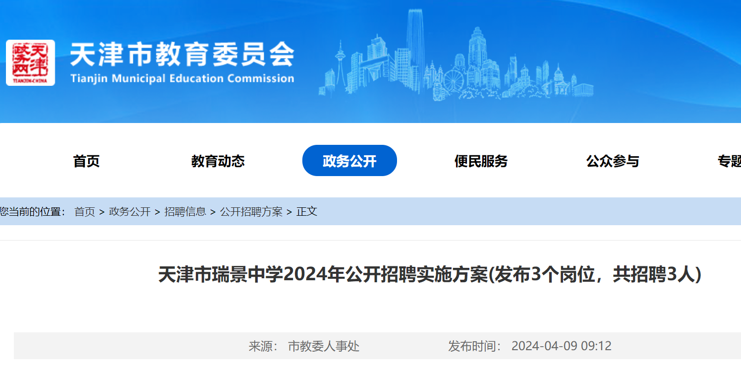 2024年天津市瑞景中學公開招聘實施方案已發(fā)布,報名時間:2024年4月14日16:00至4月19日16:00?,F(xiàn)將招聘公告原文發(fā)布如下: