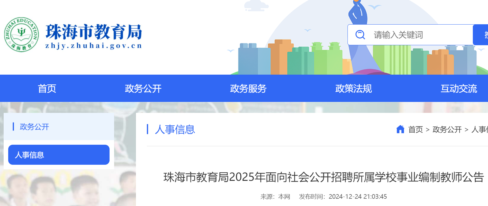 為加強教師隊伍建設,優(yōu)化教師隊伍結構,大力推進珠海教育高質量發(fā)展,根據(jù)《廣東省事業(yè)單位公開招聘人員辦法》(廣東省人民政府令第301號)及珠海市有關文件精神,經研究決定,珠海市教育局2025年公開招聘教師157名。現(xiàn)將招聘有關事項公告如下。