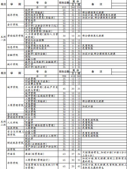 該校分為兩個批次錄取。第一批有21個專業(yè)及專業(yè)方向,計劃錄取總數(shù)為810人,其中文科260人,理科550人。第二批次有29個專業(yè)及專業(yè)方向,計劃錄取總數(shù)為998人,其中文科418人,理科580人。