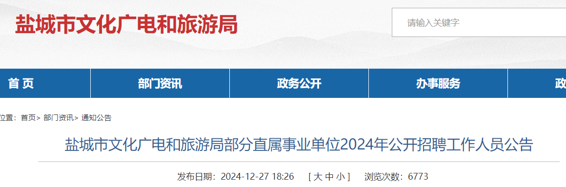 小編根據(jù)鹽城市文化廣電和旅游局發(fā)布“鹽城市文化廣電和旅游局部分直屬事業(yè)單位2024年公開招聘工作人員公告”得知,2024江蘇鹽城市文化廣電和旅游局部分直屬事業(yè)單位招聘8人,報(bào)名時(shí)間為2025年1月2日至2025年1月8日。