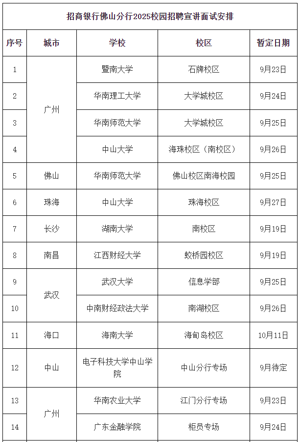 9月,我們計劃走進以下學校舉行校園宣講會,并在宣講結束后立即開展首輪面試!請您盡早網申投遞簡歷,具體安排我們將以短信方式進行通知,也可通過“招商銀行佛山分行”微信公眾號關注相關信息。
